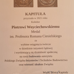 Kapituła Medalu im. Profesora Romana Ciesielskiego przyznała w 2021 roku medal Profesorowi Piotrowi Woyciechowskiemu za wybitne osiągnięcia twórcze w dziedzinie inżynierii lądowej i wyróżniającą się działalność społeczną na rzecz budowania autorytetu Polskiego Związku Inżynierów i Techników Budownictwa oraz wierność ideałom Związku.