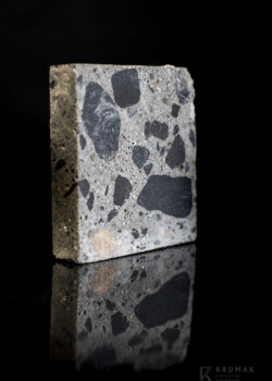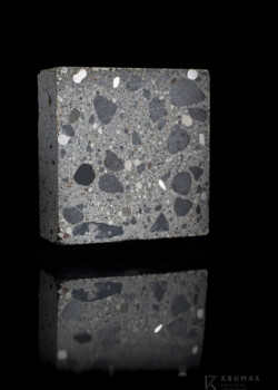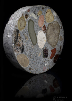 Zdjęcie przedstawia próbkę przygotowaną do badań makroskopowych. Przedmiotem badania był beton, w którym jako kruszywo grube zastosowano kruszywo magnetytowe w celu poprawy właściwości ekranowania promieniowania gamma. Więcej na temat betonu magnetytowego przeczytasz m.in. w tym artykule: Piotrowski, T., Tefelski, D. B., Sokołowska, J. J., & Jaworska, B. (2015). NGS-concrete-new generation shielding concrete against ionizing radiation-the potential uation and preliminary investigation. Acta Physica Polonica A, 128(2B), B-9. DOI: http://dx.doi.org/10.12693/APhysPolA.128.B-9
