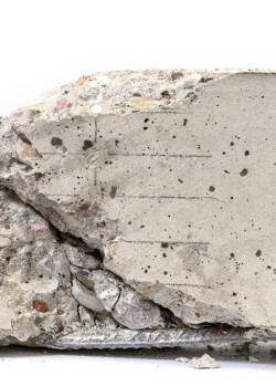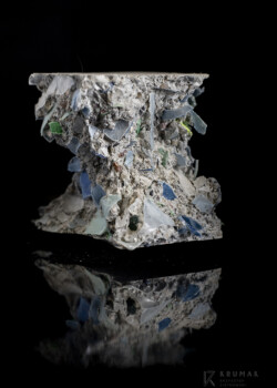 Próbka pozostała po teście wytrzymałości na ściskanie. Przedmiotem badania był beton polimerowo-cementowy (PCC) z kruszywem grubym frakcji 0/4 mm ze zmielonego poli(tereftalanu etylenu) - PET, pochodzącego z recyklingu butelek po napojach. Udział kruszywa z PET stanowił 25% sumarycznej objętości wypełniaczy. Wartość wytrzymałości na ściskanie kompozytu wyniosła 27 MPa.