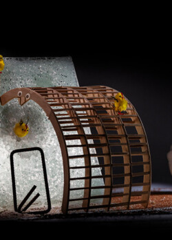 Zakrzywiona konstrukcja z drewna klejonego warstwowo wsparta na wzmocnionej lokalnie płycie szklanej podpartej punktowo po badaniu niszczącym. Drewno klejone warstwowo posiada wiele cech, które czynią je idealnym materiałem do budowy najróżniejszych typów konstrukcji. Elementy z drewna klejonego warstwowo są ognioodporne, wytrzymałe, lekkie i trwałe oraz mogą być łatwo kształtowane dokładnie w takich wymiarach, jakich wymaga dana konstrukcja